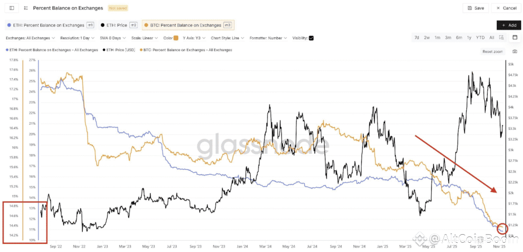 Glassnode data shows a steady drop in exchange balances for both Bitcoin and Ethereum. Bitcoin’s share slipped from about 16% in mid-2023 to 12%, while Ethereum’s fell from roughly 19% to under 13% by late 2025.
