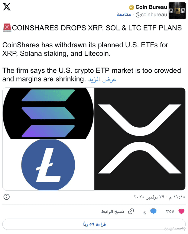سحبت CoinShares خططها الخاصة بـ XRP وSolana وLitecoin ETF بسبب ازدحام السوق الأمريكية.