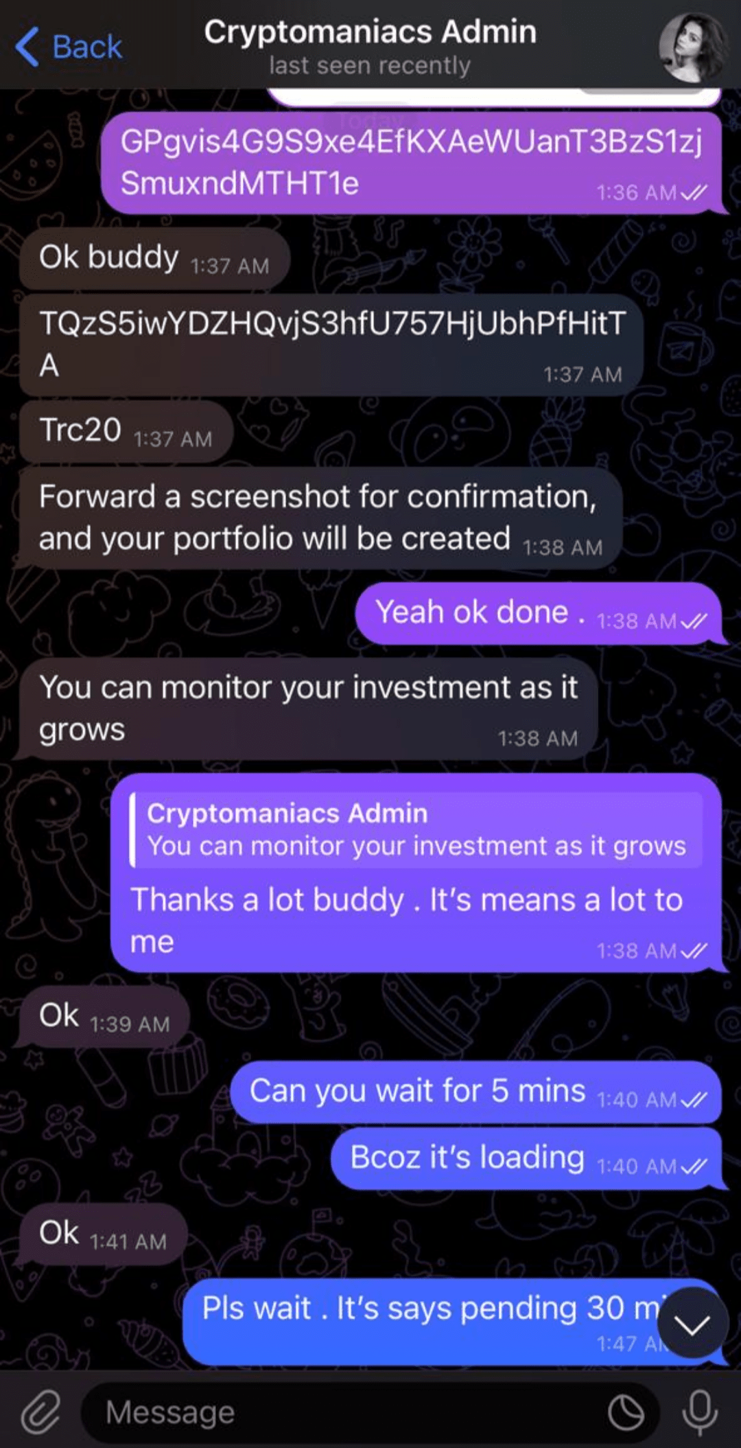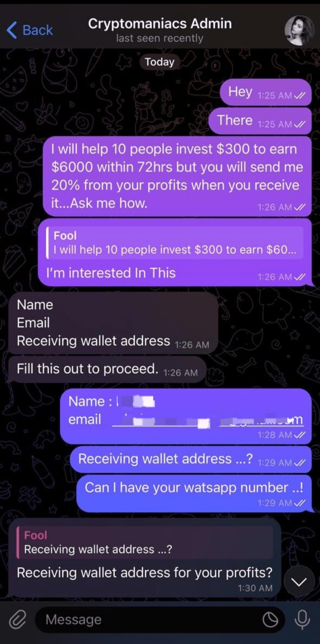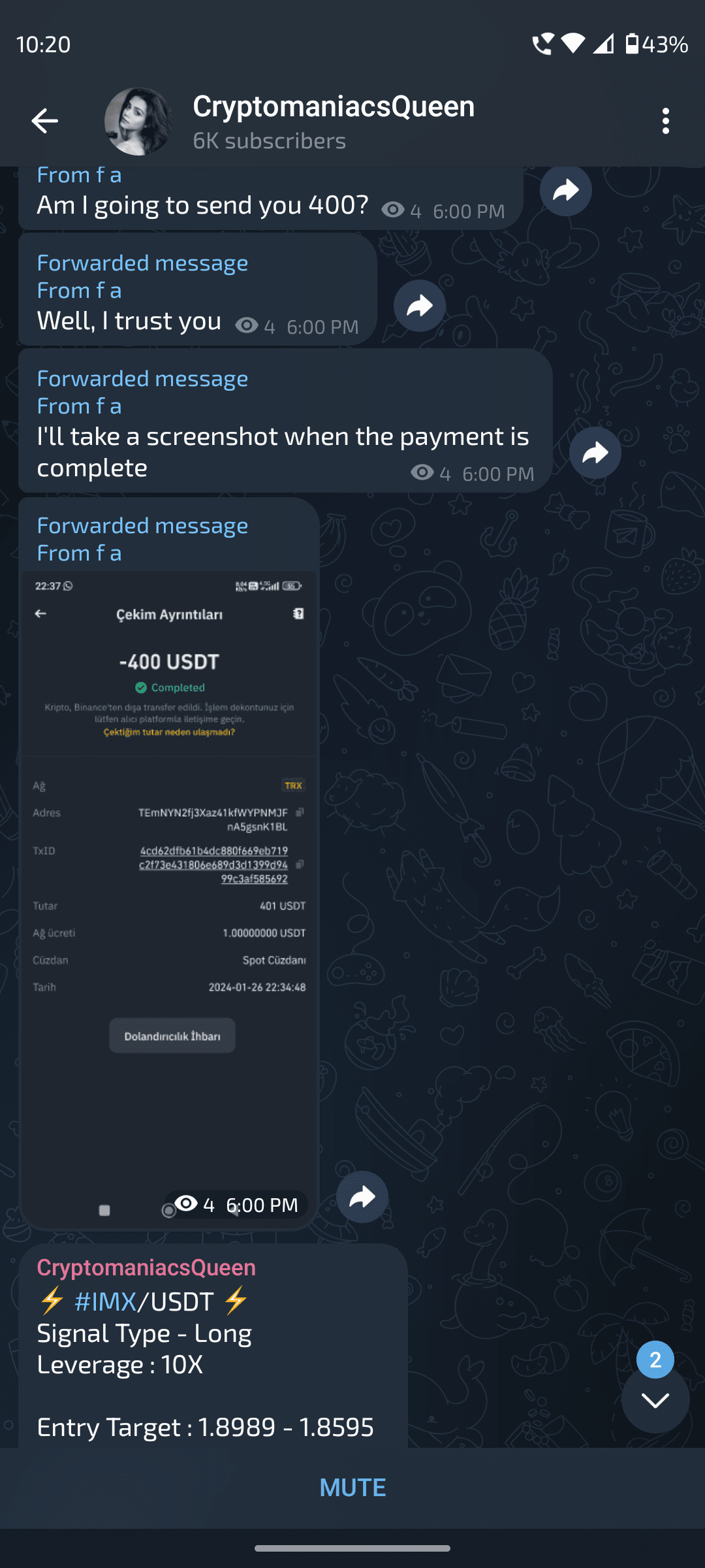 One of my friend recently saw a post on binance for futures calls @CryptoManiacsQueen , joined his/her telegram channel. She started an investment package minimum of $100 investment , so if you invest $300 you will receive $6000 in 78hrs(I warned him before entering this scam) he paid her $300 usdt via trc20 .