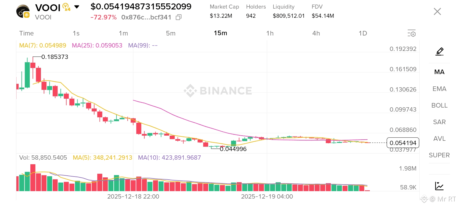 $VOOI is a cross-chain Perp DEX aggregator. The current price action is typical of a newly listed token (listed on major exchanges like Gate.io and Binance Alpha yesterday, Dec 18). The "72.97% drop" shown in your screenshot is the standard "price discovery" phase where the initial listing pump meets heavy selling pressure from airdrop claimants and early seed investors.