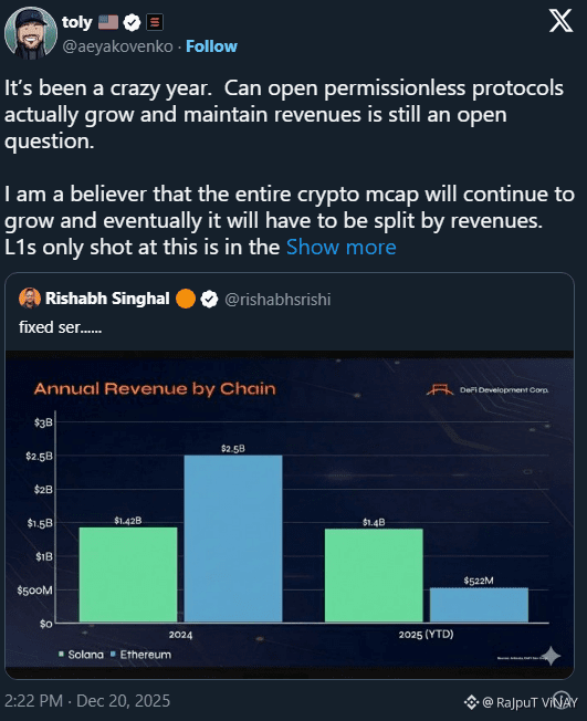 In another post on X, Yakovenko described the past year as “crazy” and questioned whether open, permissionless protocols can sustainably grow and maintain revenues over time. He argued that this challenge remains unresolved for much of the industry.