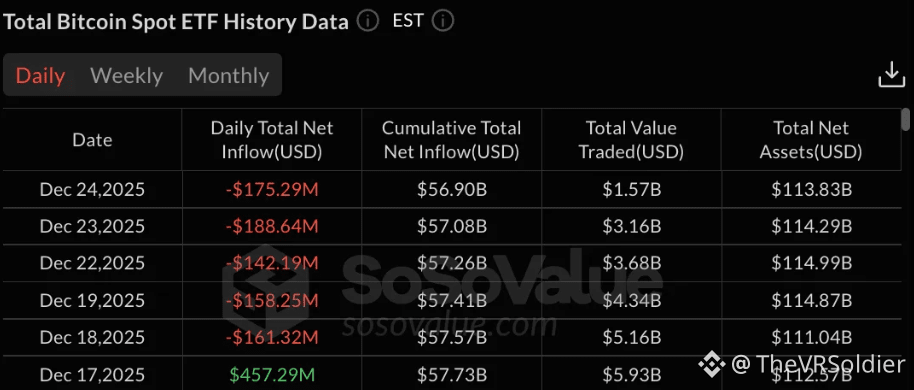 Spot Bitcoin exchange-traded funds posted another day of net redemptions on December 26, extending a five-session withdrawal streak as Bitcoin remained capped below key resistance levels. Net outflows for the day totaled about $83 million, bringing cumulative redemptions during the streak to more than $750 million.