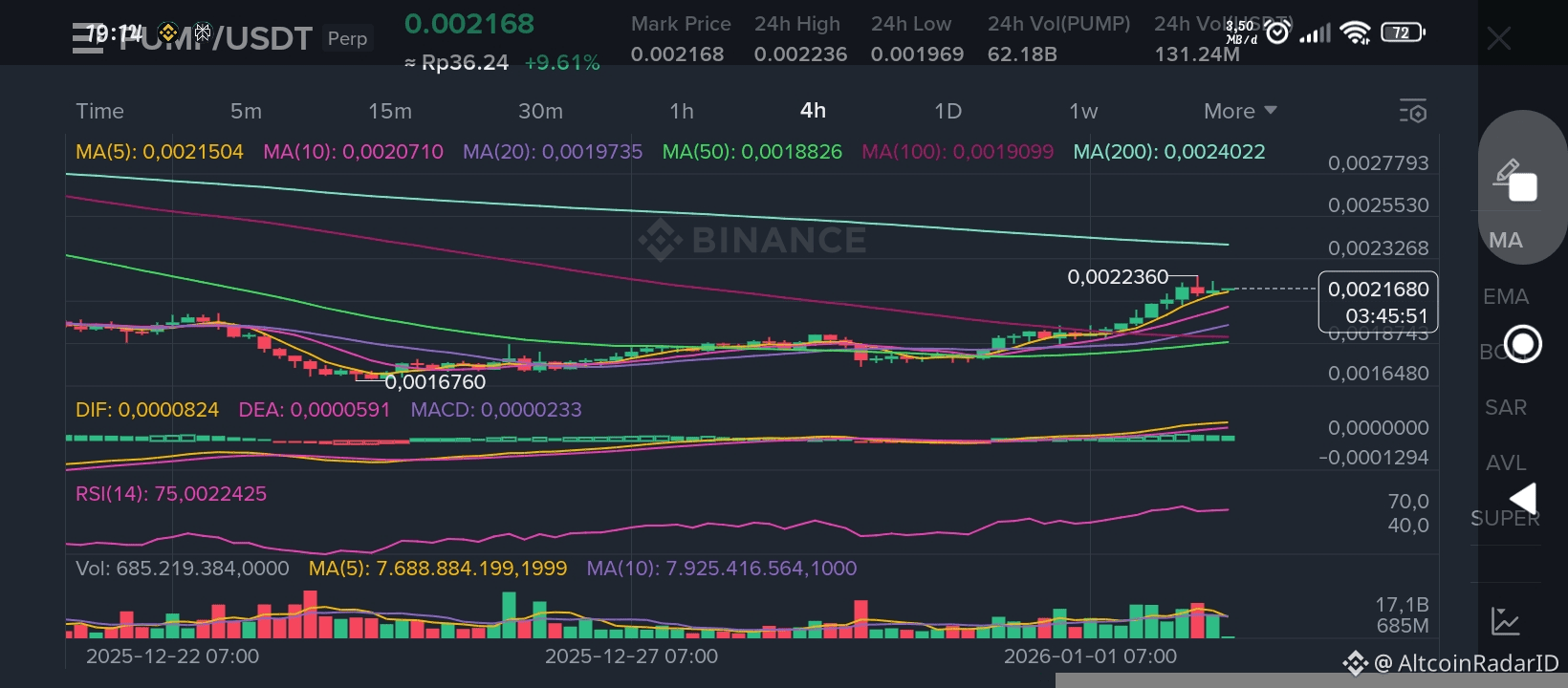 Timeframe 4J (Macro): Tren masih sangat bullish dengan harga kokoh bertahan di atas garis MA5 (0.002138) dan MA10 (0.002047).