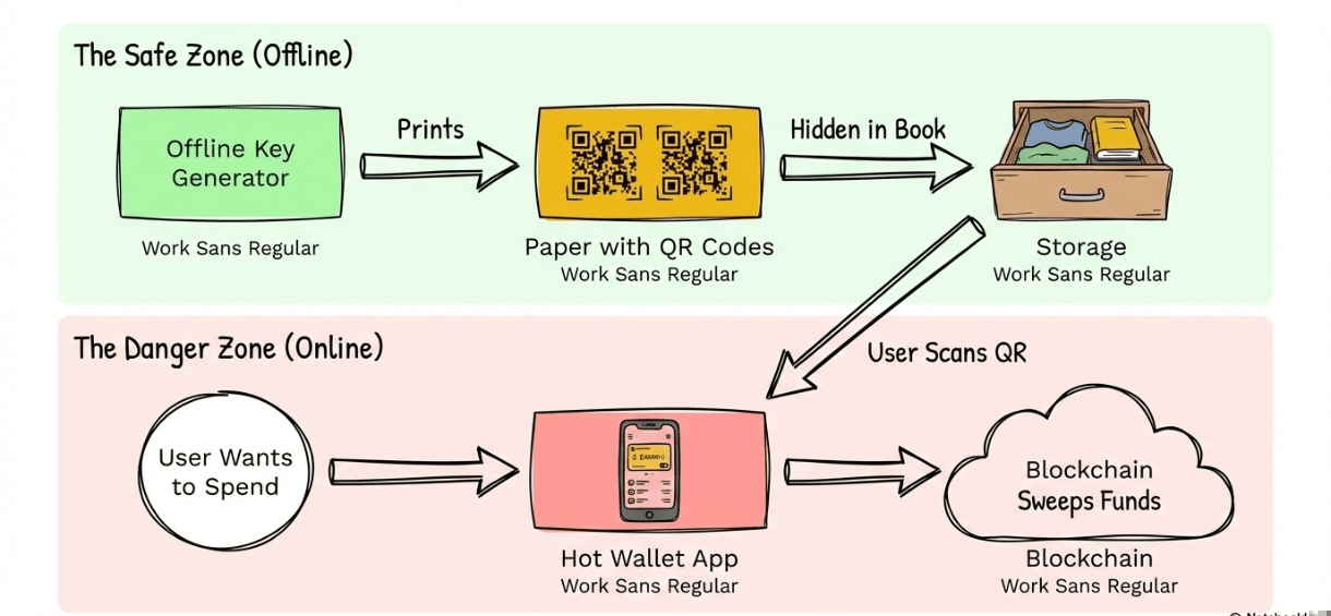 The "Sweep" Mechanic: You can't easily spend some of the money on the paper. To use it, you usually have to "Sweep" (transfer) the entire balance off the paper and onto a Hot Wallet (like MetaMask). It’s like breaking a piggy bank—once you crack it open, you have to take everything out.