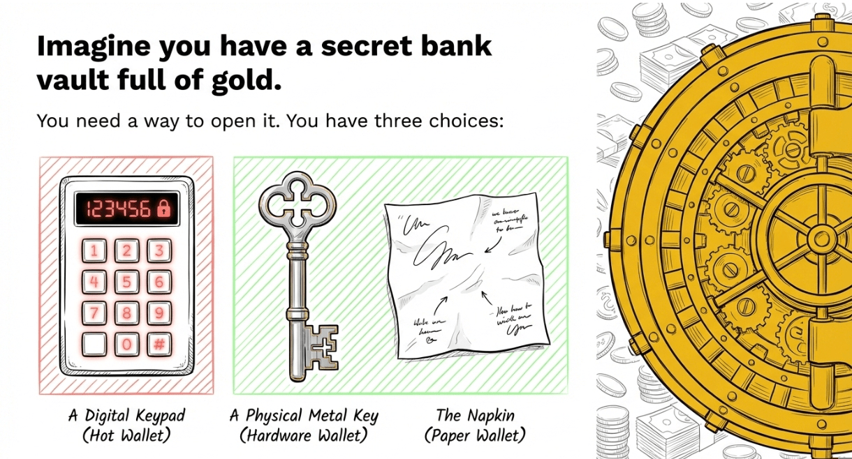 Instead of having a digital keypad (Hot Wallet) or a physical metal key (Hardware Wallet), you just write the Combination Code on a napkin, fold it up, and hide it inside your favorite book.