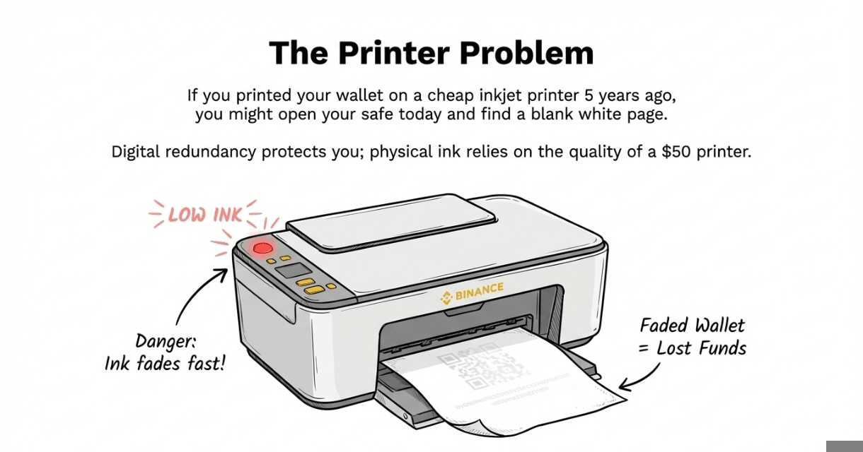 The "Ink" Risk: It sounds secure, but paper is fragile. Ink fades, paper rots, and water destroys it. If you printed it on a cheap inkjet printer 5 years ago, you might open your safe today and find a blank white page. Your money is gone.