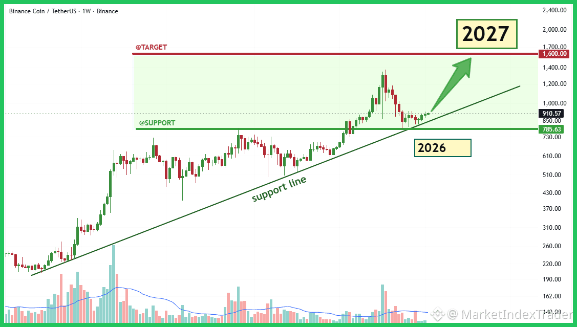 The price action has pulled back significantly from its recent highs but has landed precisely on the confluence of two critical support zones: the major ascending trend line (dating back to 2026) and the strong horizontal support around $785 - $910. This support structure is currently holding firm, confirming the macro bullish trend remains intact. If $BNB maintains structure above the trend line, the path of least resistance is up, targeting the major long-term resistance and price discovery zone at $1600 by 2027, as indicated on the chart.