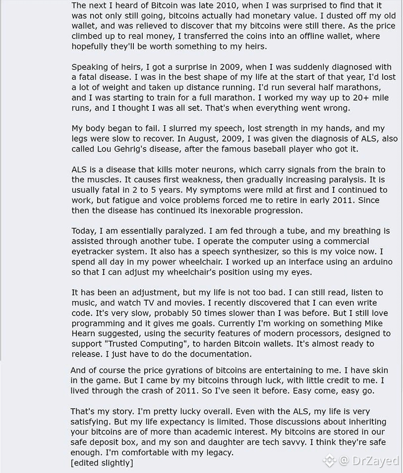 However, the story of Hal Finney is also one of profound personal courage and tragedy. Just as Bitcoin began to gain its first traces of mainstream attention, Hal was dealt a devastating blow. In August 2009, he was diagnosed with Amyotrophic Lateral Sclerosis (ALS), also known as Lou Gehrig’s disease. It is a progressive neurodegenerative disease that slowly paralyzes the body while leaving the mind fully intact.