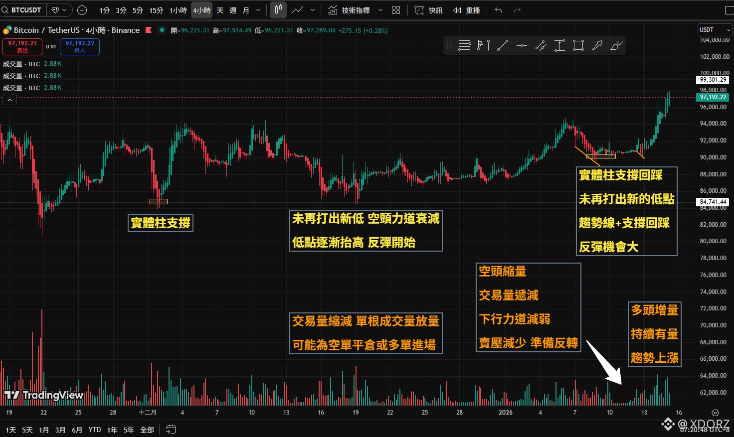 在這個過程中,如果成交量縮小(低於 0.7 倍平均量),代表空方動能不足,是短線和波段多單進場的好時機。此時的盈虧比通常不錯,可以嘗試低接反彈行情。