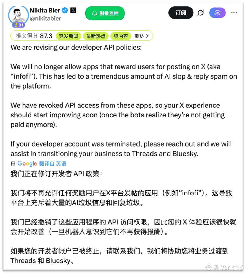 随着X官方切断“引导发帖换取奖励”的接口权限,我们不得不面对一个残酷的现实:推特嘴撸已死,InfoFi正在被迫经历一场血腥的去中心化重构。