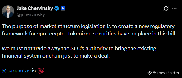 However, Miles Jennings, Head of Policy and General Counsel at Andreessen Horowitz, rejected that idea. He said the bill does not prevent tokenized securities and that restating existing law does not change how the industry is regulated.