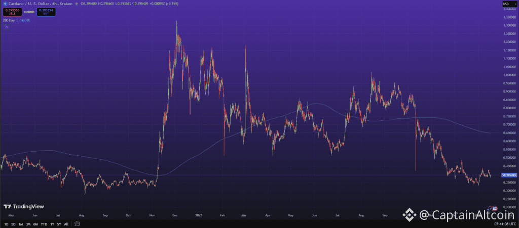 We had a look at the ADA chart and the Cardano price is trading near the $0.39–$0.40 zone. This area has acted as a key support several times over the past year. Each dip into this range has attracted buyers, which indicates strong demand below $0.40.