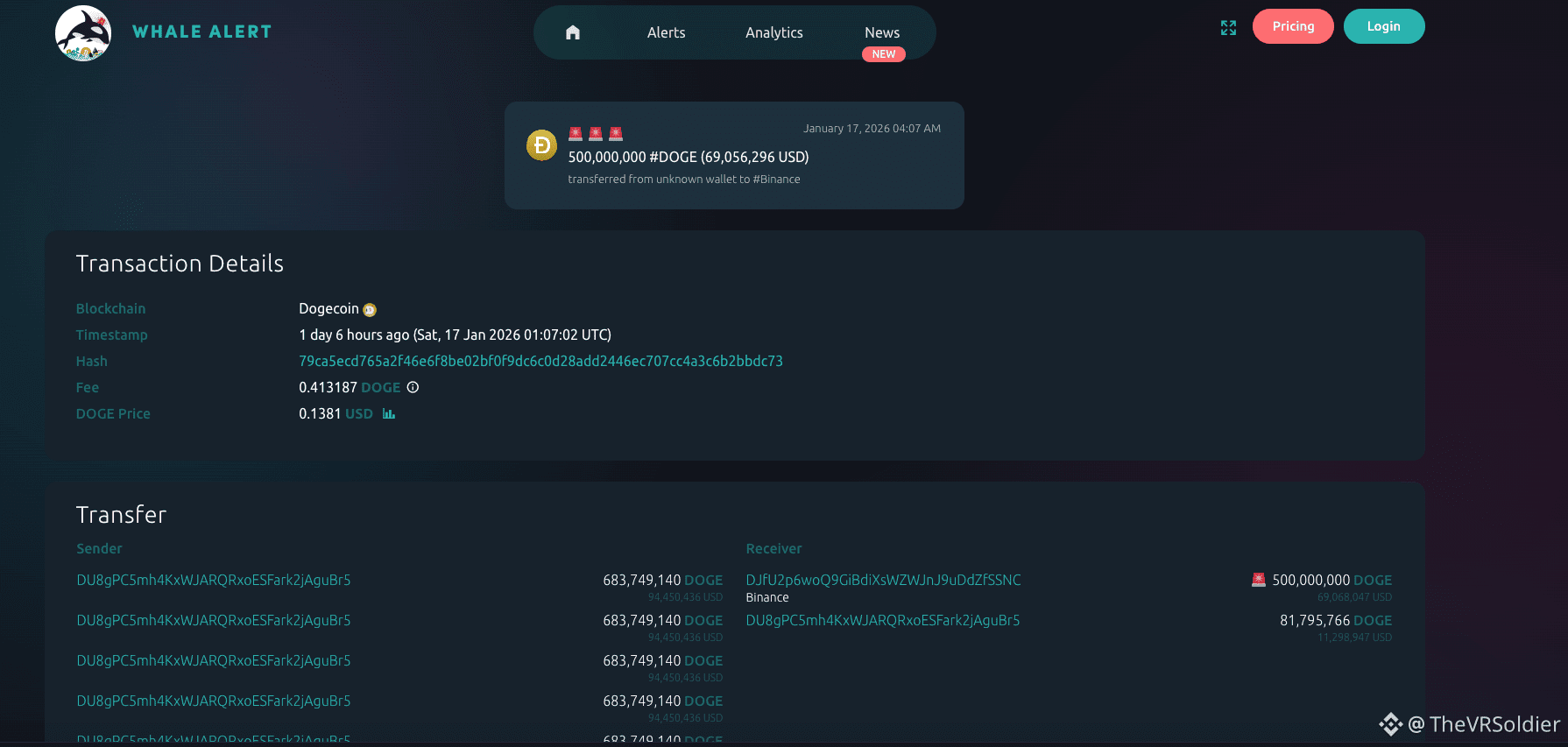 According to Whale Alert, a wallet transferred 500 million DOGE to Binance. Such a large transfer to an exchange is often interpreted as preparation to sell, not accumulate.