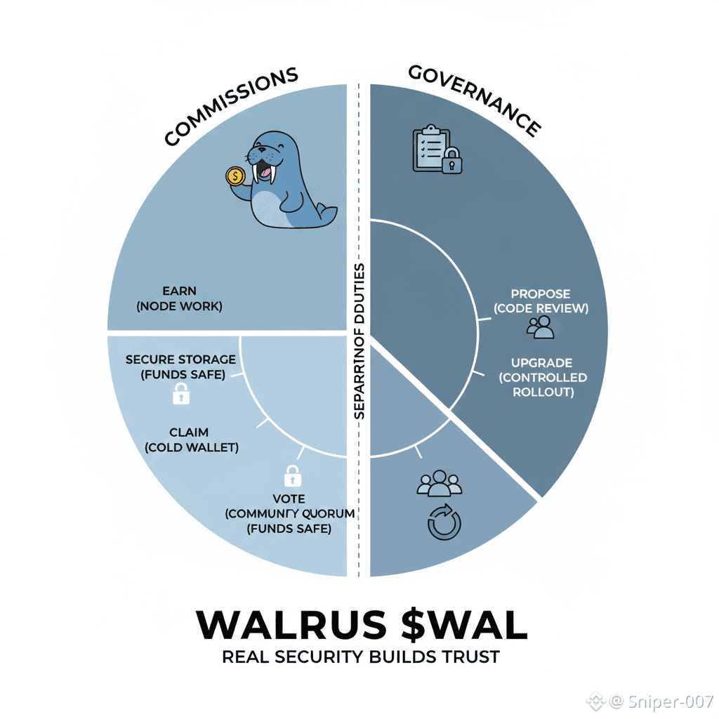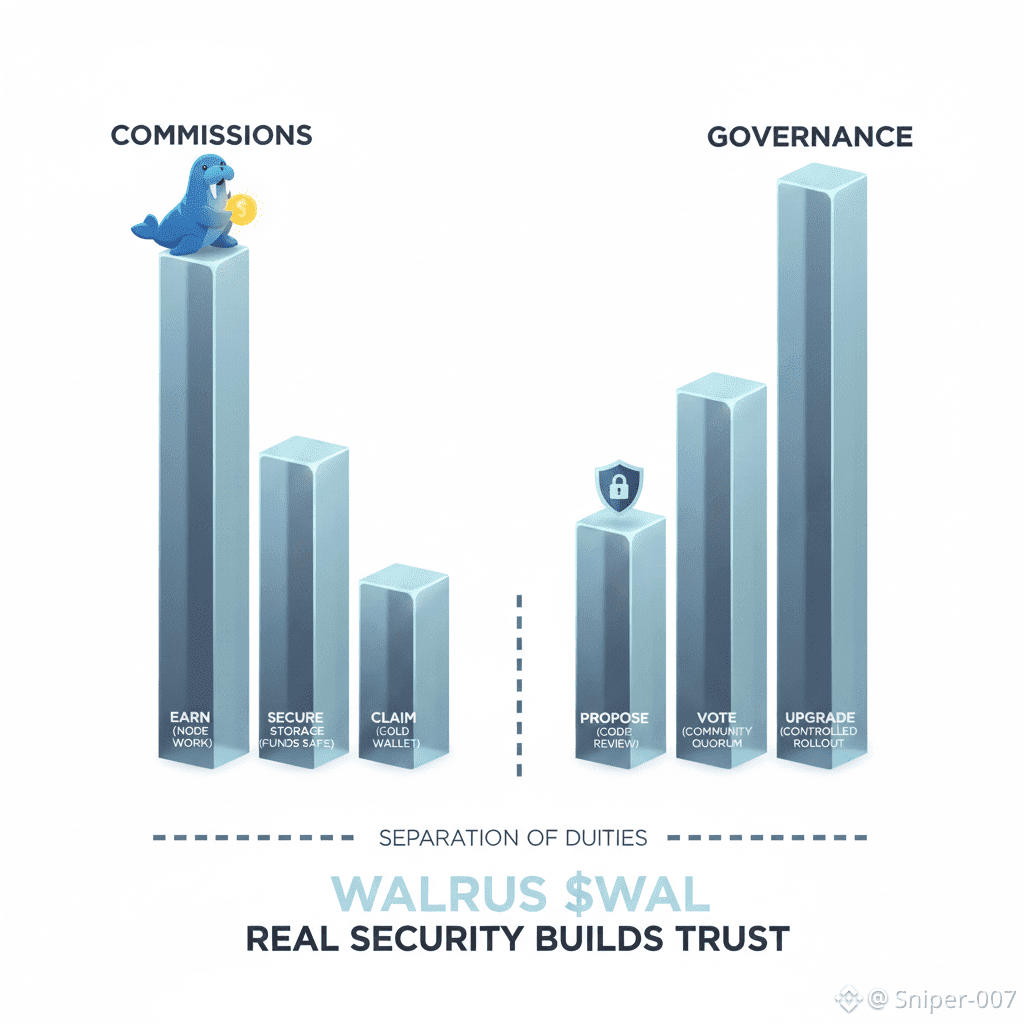 Honestly, @Walrus 🦭/acc is starting to feel different from a lot of other crypto projects out there. Sure, the decentralized blob storage on Sui is impressive, but what’s really catching my eye lately is how seriously they take the “boring but important” stuff—like who gets paid what and who gets to decide big changes. In crypto, once the hype fades, solid ops and fair rules are what keep things alive long-term. Walrus gets this. They deliberately keep everyday node-running tasks completely separate from the dangerous stuff: withdrawing your earned commissions and approving protocol upgrades. It’s a simple but powerful choice that screams “we’re thinking about security and sustainability, not just launches.”