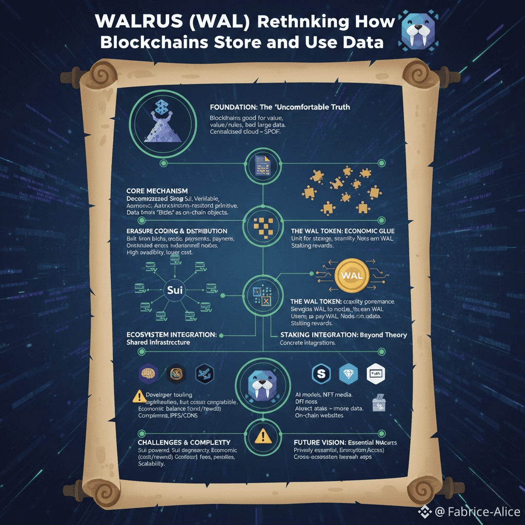 Walrus is tightly integrated with the broader blockchain ecosystem, particularly Sui. Developers building on Sui can rely on Walrus as a native storage layer for applications that generate far more data than blockchains can handle directly. This is especially relevant for sectors such as decentralized finance, gaming, artificial intelligence, and social platforms. Walrus effectively provides a data layer that blockchains can depend on without compromising decentralization. Although Sui is the initial focus, the protocol is designed with long-term flexibility in mind, allowing for future integration with other chains as demand grows.