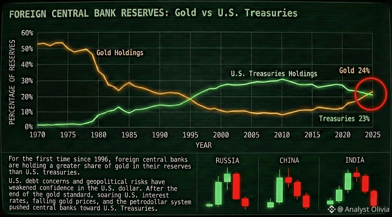 For the first time in three decades, central banks now hold more gold than U.S. Treasury debt.