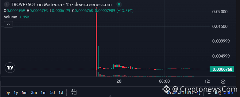 TROVE launched with an expected market capitalization of about $20 million, but within ten minutes of going live, the token plunged to around $0.0008, cutting its valuation to under $2 million, as shown by DEXScreener data.