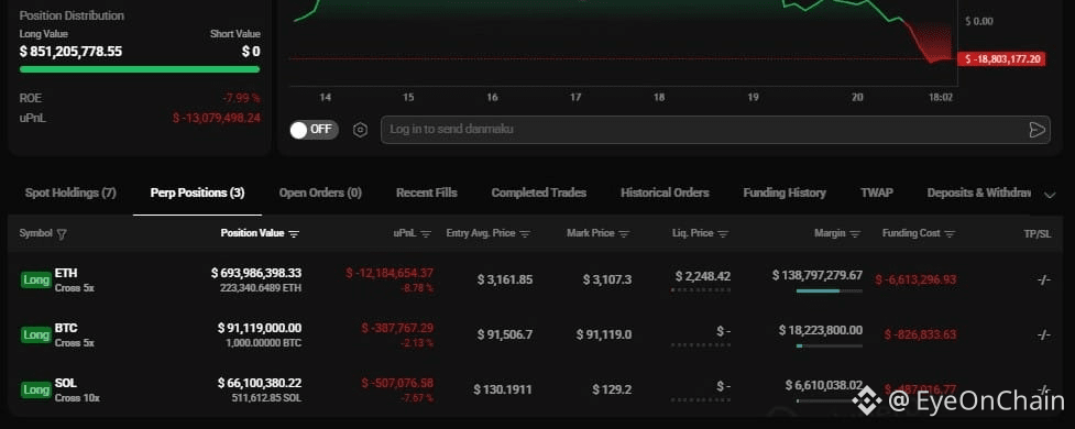 There’s the infamous “flash crash insider” whale, 0xb317d2bc2d3d2df5fa441b5bae0ab9d8b07283ae. This account holds Hyperliquid’s top ETH long and ranks third on BTC longs. The scale is unreal -- $851 million in total position size, currently sitting on a $13 million unrealized loss. The exposure spans 1,000 BTC, a staggering 223,340 ETH, and 511,612 SOL. It’s a bet that doesn’t flinch. Even underwater, it stays.