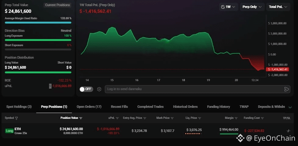 A smaller giant in comparison, but still massive by any human standard, $24.8 million in total exposure, down about $1 million, holding a straight 8,000 ETH long.