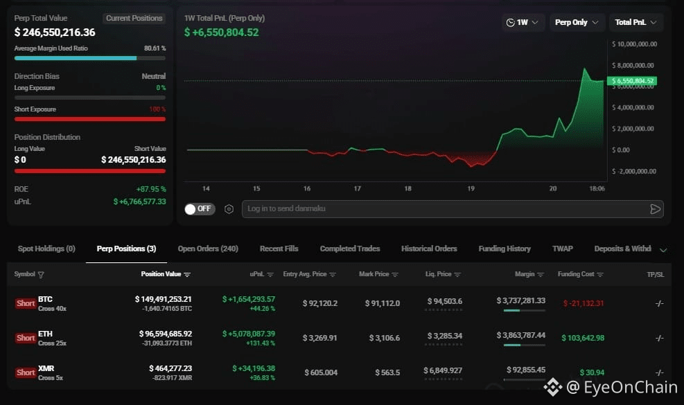 Right beside it is another monster, 0xd83516572789f1c782c8298efce58a5600318fd7. This one ranks as BTC short #2 and ETH short #3 on the platform. Total exposure? About $246 million. Unrealized profit sits near $6.7 million. The positions include 1,640 BTC, 31,093 ETH and 823 XMR, all pointed downward.Just full-on conviction that the market’s not done bleeding.