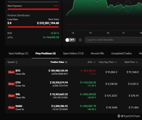 On one side, the bears are swinging heavy. The address known as Strategy’s counterparty, 0x94d3735543ecb3d339064151118644501c933814, is sitting as Hyperliquid’s top BTC short. This wallet controls around $233 million in positions, floating a modest $744k profit for now, while leaning short on 2,078 BTC, 6,550 ETH, 142,160 SOL and even 74,167 DASH. It’s not a trade, it’s a worldview.