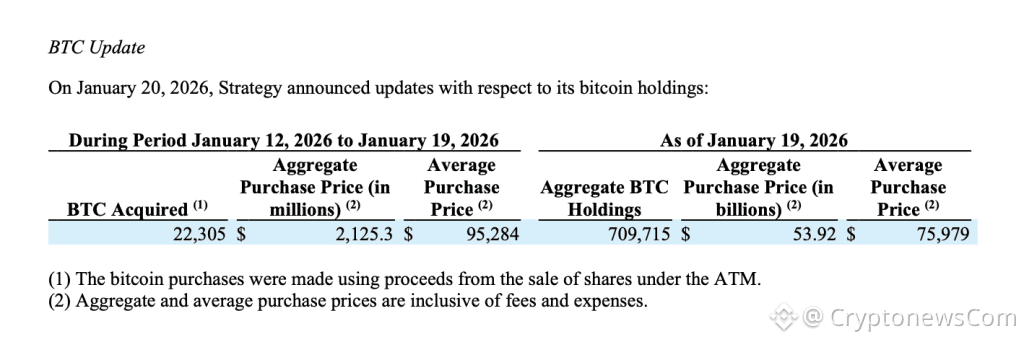 Strategy has acquired 22,305 BTC for ~$2.13 billion at ~$95,284 per bitcoin. As of 1/19/2026, we hodl 709,715 $BTC acquired for ~$53.92 billion at ~$75,979 per bitcoin. $MSTR $STRC $STRK $STRF $STRD $STRE https://t.co/6hpAeOxp2I