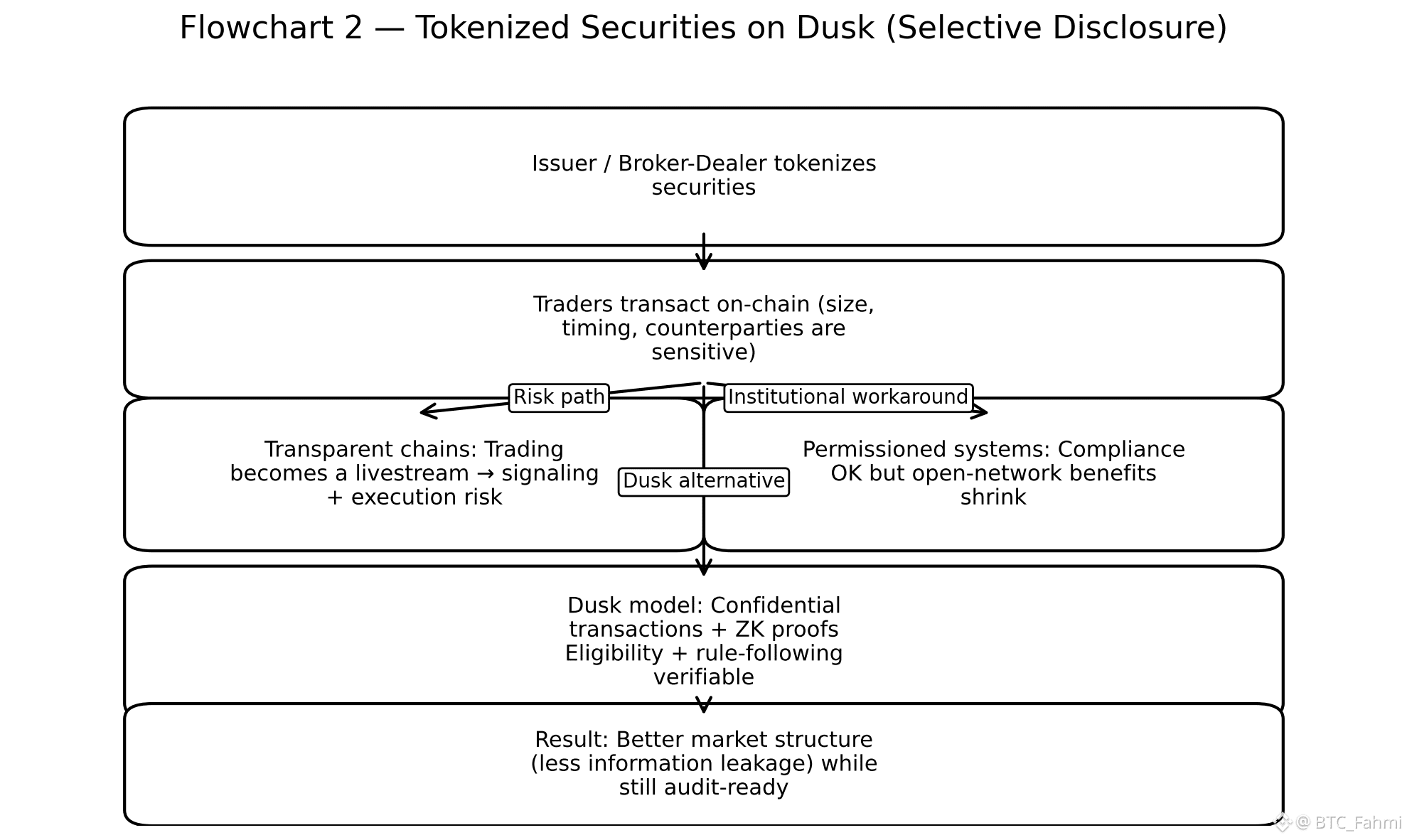 A simple real-world example makes this click. Imagine a broker-dealer issuing tokenized securities, and clients trading them on-chain. The trades themselves contain information: size, timing, counterparties, sometimes even strategy. In traditional markets, those details are not a public livestream. If you replicate the same security on a fully transparent chain, you basically force every participant to trade while being watched. So the institutional choice becomes obvious: either don’t use the chain, or only use it in a heavily permissioned way that kills the open-network advantage. Dusk’s bet is that selective disclosure lets regulated markets stay regulated without turning the marketplace into a glass box.