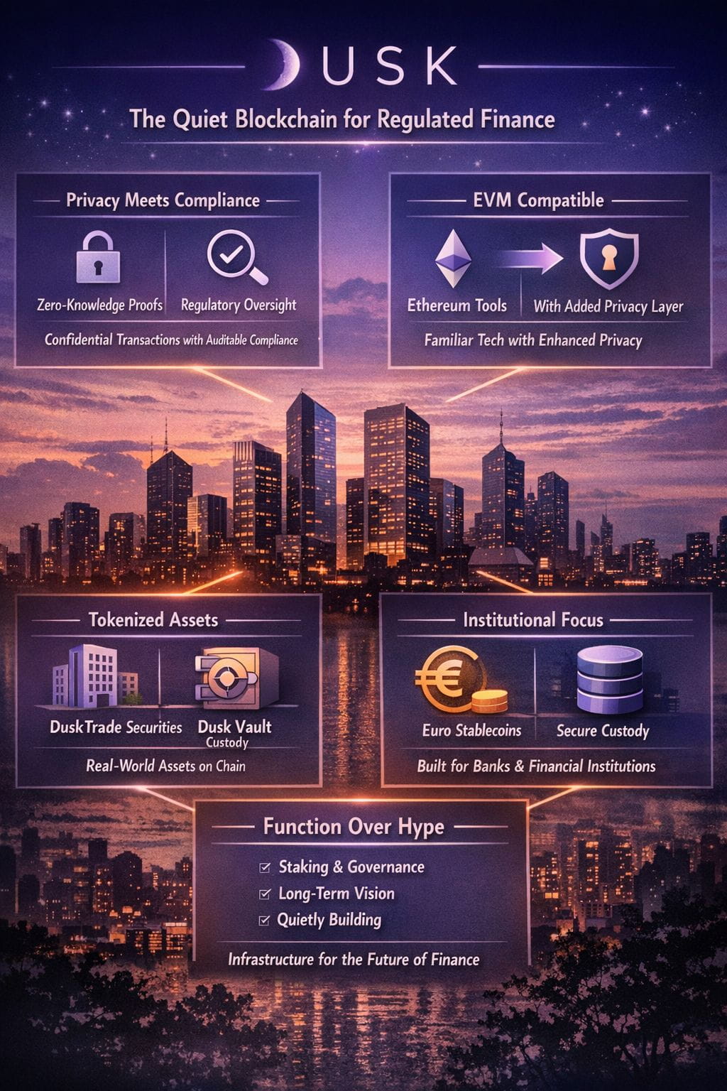 Dusk is not trying to be loud,viral, or trendy. It is not chasing meme culture or fast hype cycles. Instead, Dusk is building something far more ambitious and far more difficult: a blockchain that regulated financial institutions can actually use without breaking the rules. At its core, Dusk is a privacy-focused Layer-1 network designed for real money, real companies, and real laws. The kind of blockchain banks, exchanges, and asset issuers don’t laugh off—but slowly start to take seriously.