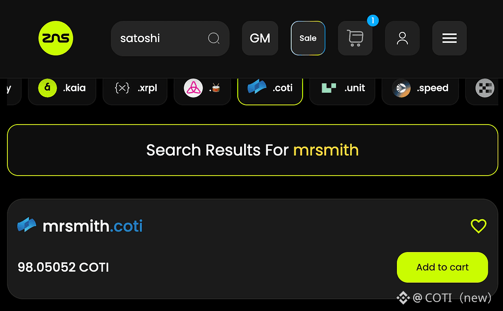 A .coti domain is a human-readable on-chain identity powered by ZNS and native to the COTI ecosystem.
