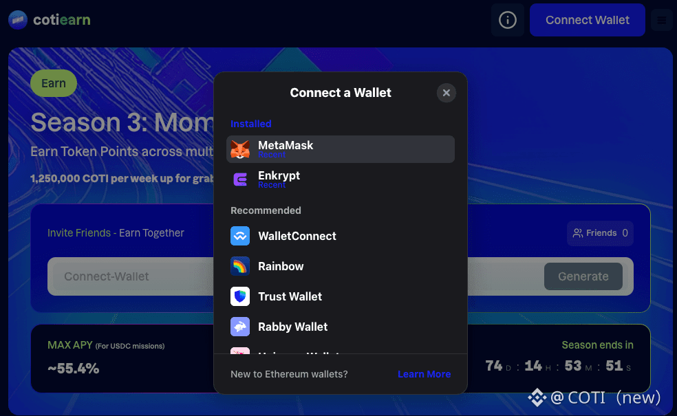 Instead of sharing long wallet addresses, users can use a simple name like yourname.coti as their on-chain identity. That identity can be used across wallets, dApps, and services, and now, directly within COTI Earn.