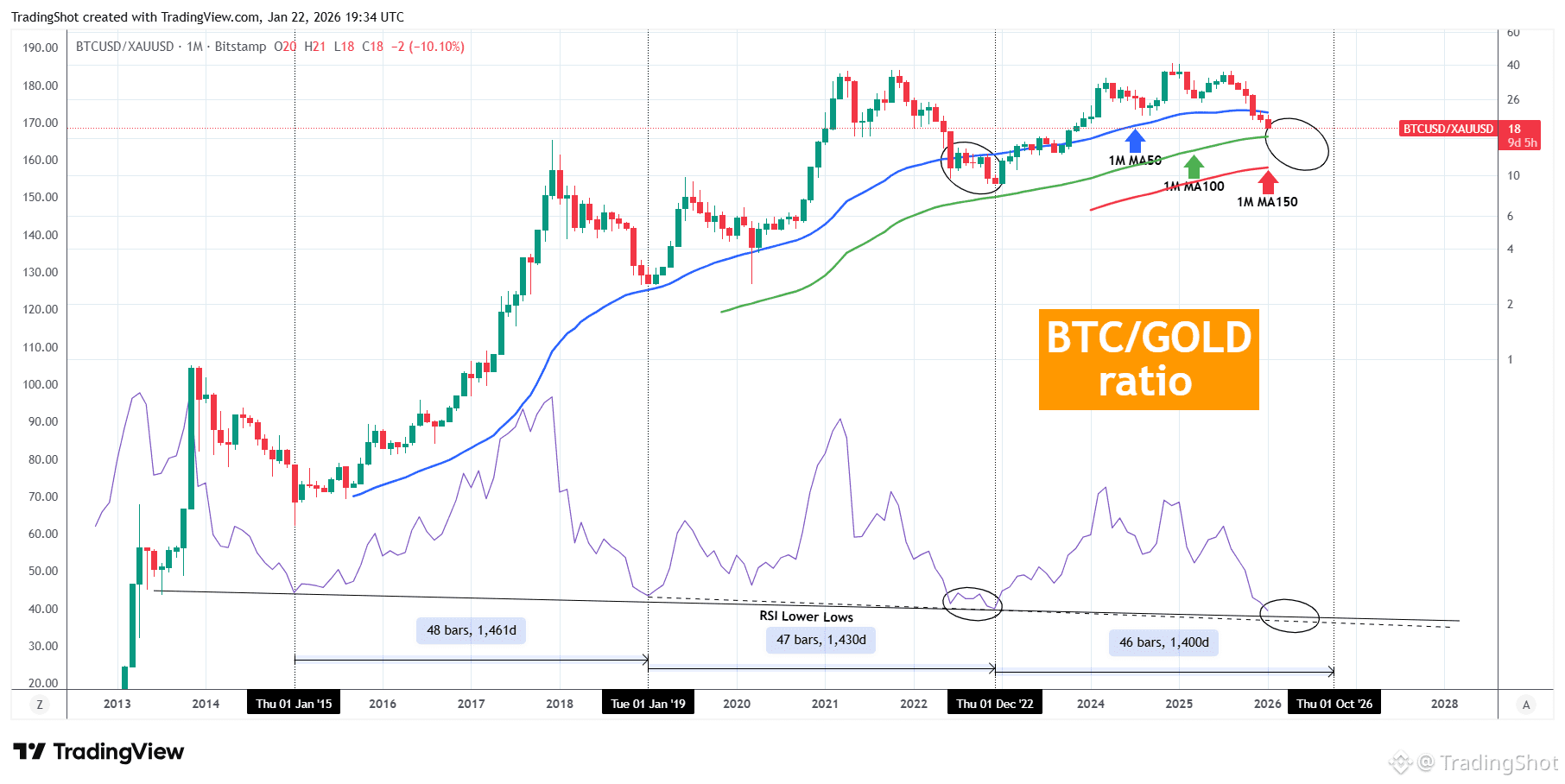 Bitcoin (BTCUSD) remains under heavy pressure since its October 2025 All Time High (ATH) but the BTC/GOLD ratio reveals that the real selling pressure in terms of the precious yellow metal has been boiling up for some time before that date.