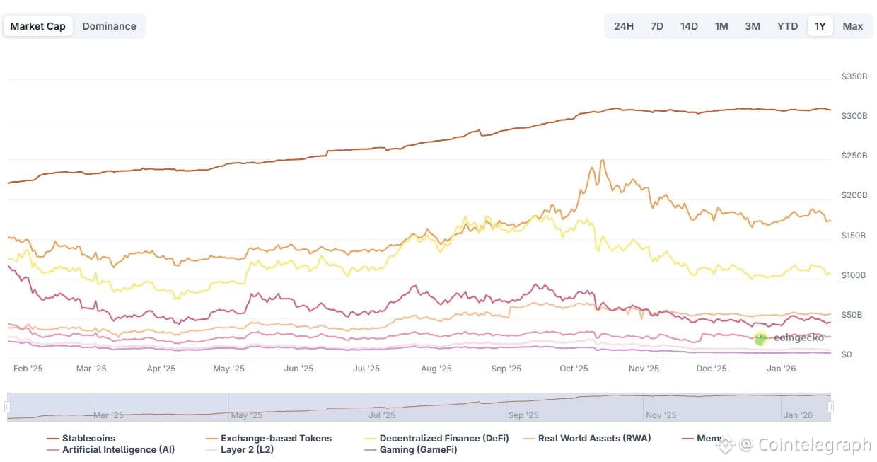 Stablecoins have seen sustained growth while other crypto sectors have declined. Source: CoinGecko