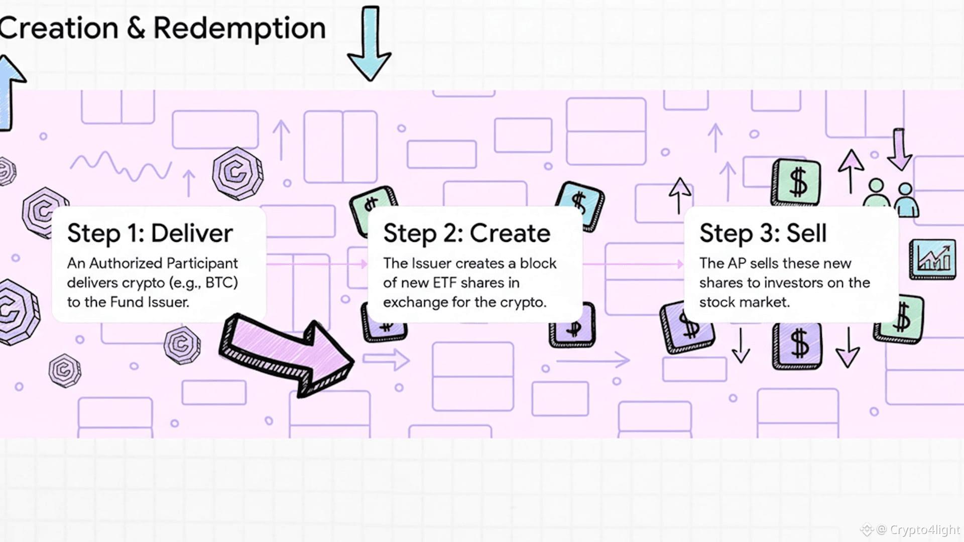 They can also return ETF shares to the fund and receive the underlying coins or cash back, which is called redemption, keeping ETF price aligned with the spot market.