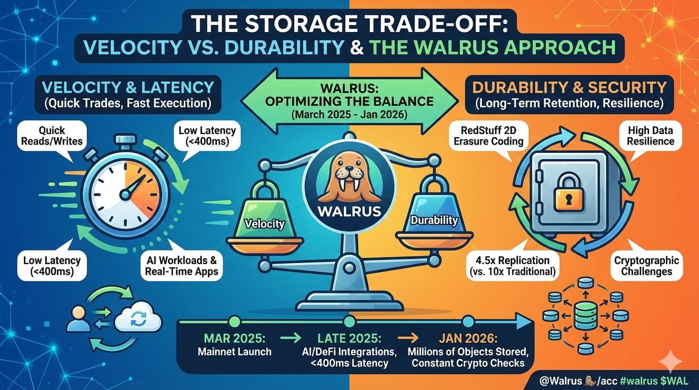 Why is this trending now? Because the AI workloads are forcing the issue. Training datasets, model checkpoints, and real-time inference logs are enormous. By late 2025, decentralized AI apps were storing terabytes of data monthly. Systems that are durable but slow become unusable in that environment; systems that are fast but fragile become risky. Walrus sits directly in that tension.