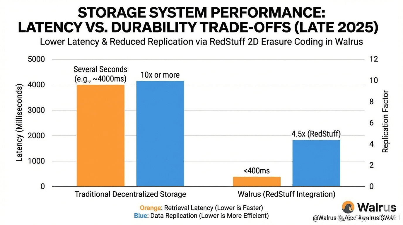 That matters because durability is expensive. Traditional decentralized storage networks often sacrifice speed for safety, leading to slow upload and retrieval times. Walrus aimed to reduce that gap. Internal benchmarks published in late 2025 showed median retrieval latency under 400 milliseconds for medium-sized files, even while maintaining strong recovery guarantees. That puts it in a very different class from early decentralized storage systems that often took several seconds.