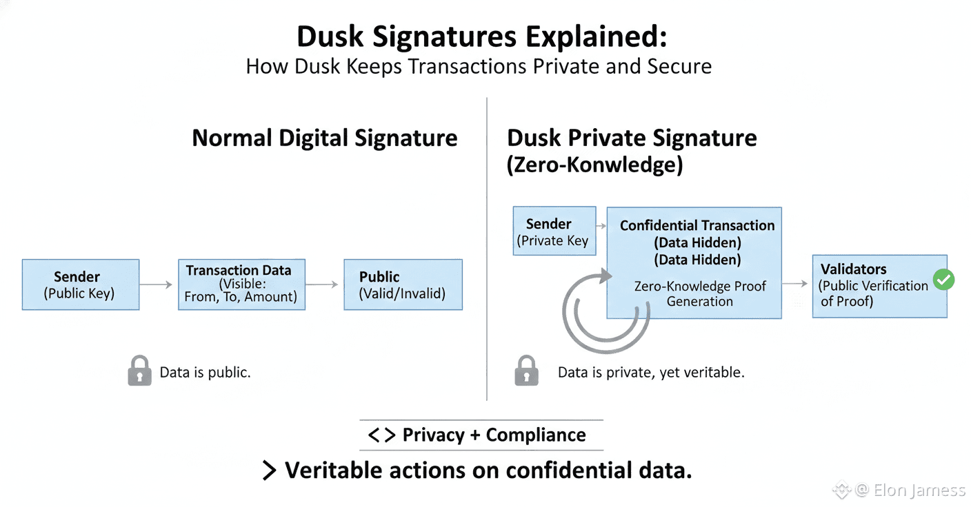 In every blockchain, digital signatures are the base layer of security. They prove a transaction is real, that the person sending it owns the funds, and that no one can change it. On Dusk this becomes even more important because the network is built for privacy, confidentiality, and compliance. So Dusk does not just use normal public signatures. It uses signature systems that work with zero knowledge proofs and private transactions.