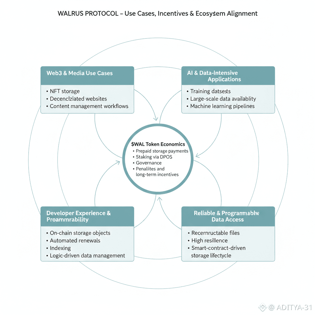 Walrus blobs ko on-chain objects me convert karta hai aur smart contracts ke sath integrate karta hai, jisse data programmable hota hai. Is se developers complex use cases — like automated renewals, on-chain indexing, and other data-centric logic — build kar sakte hain without needing separate centralized storage infrastructure.