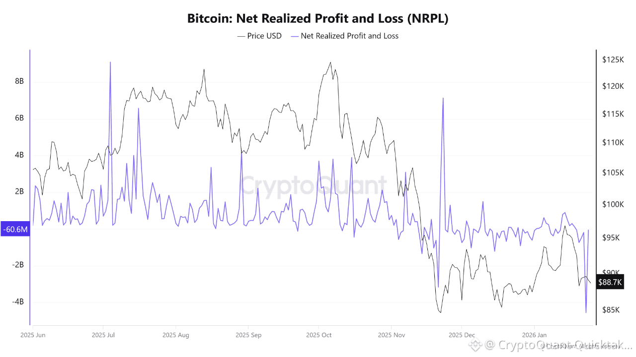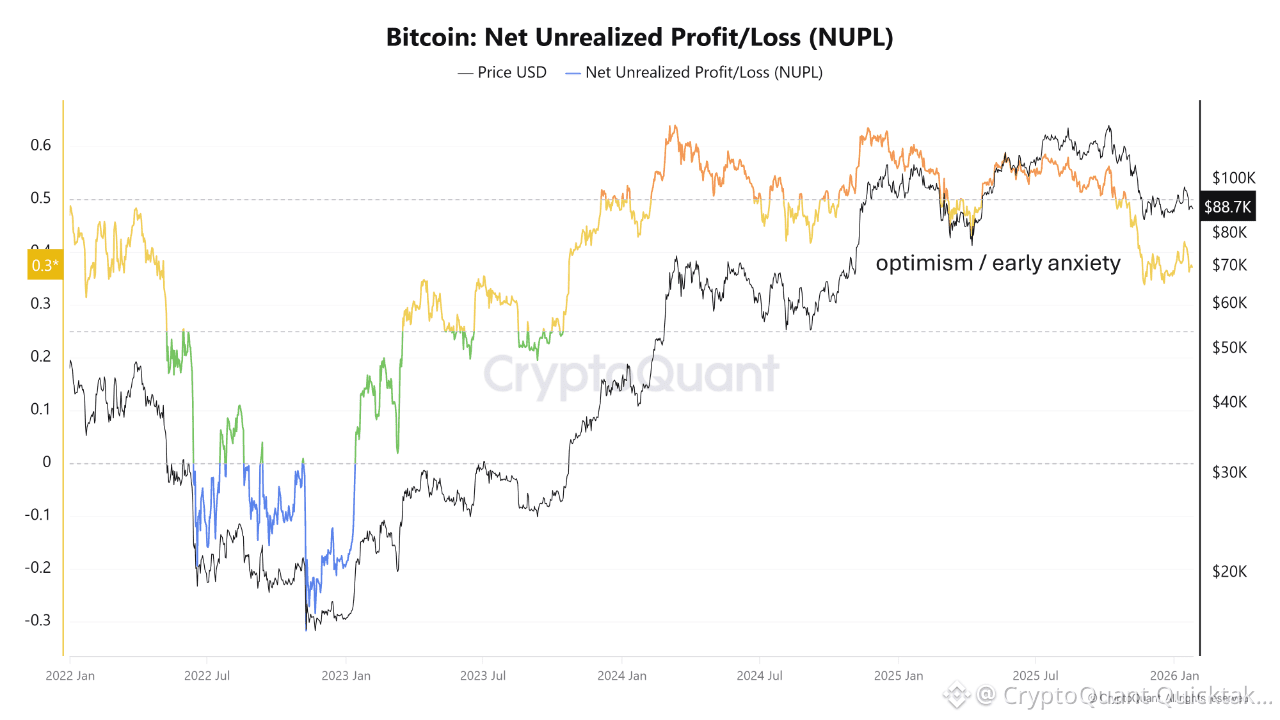 Bitcoin’s on-chain P&L structure has shifted, but it has not broken. Spot trades near $88k, while the realised price sits around $56k, so the representative holder remains comfortably in profit. Price is no longer parabolic, yet it still sits almost 60% above the aggregate on-chain cost basis, a compression of profitability, not its destruction.