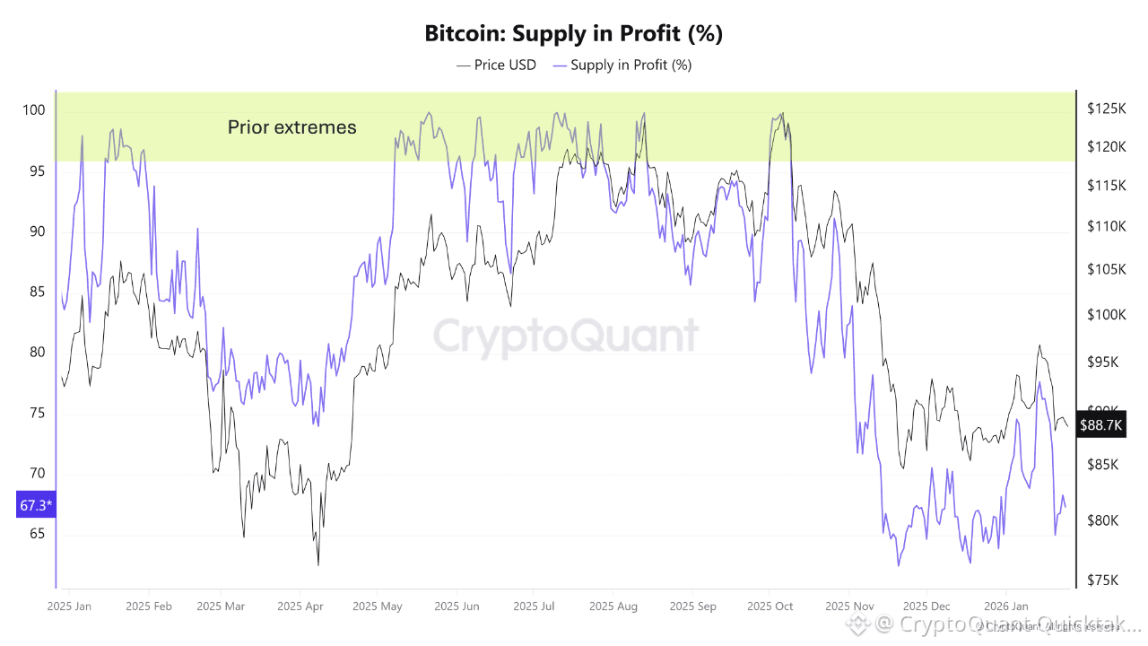 That compression is most visible in breadth. Roughly two-thirds of the supply remains in profit, and one-third now sits in loss. Earlier in the year, almost every coin was in the green; now, a meaningful minority is underwater and therefore more price-sensitive. However, these loss levels are still far from the 80–90% extremes that have historically marked cycle lows.