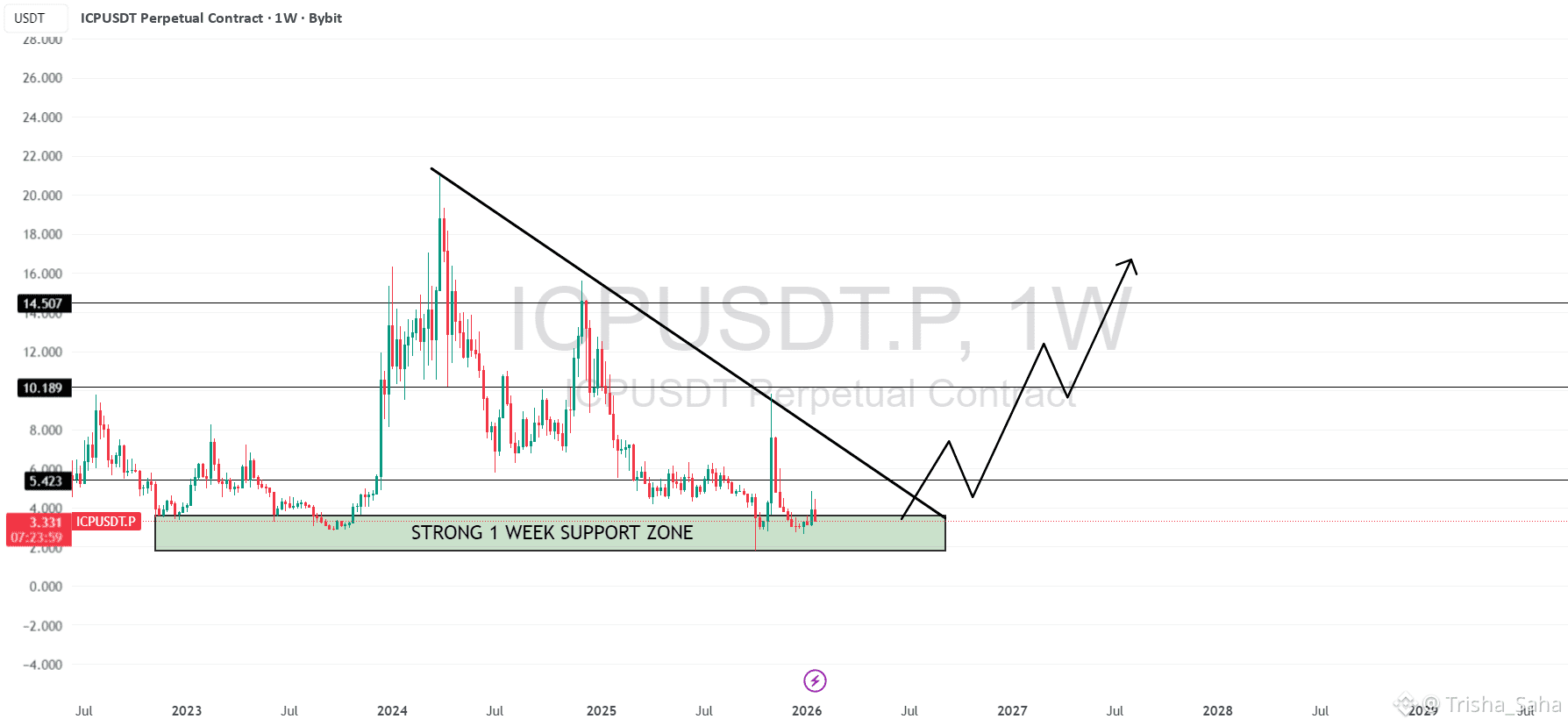 đ ICP Technical Analysis: price massiv dumped by rejecting 3 times trendline. price fell from the 20 area down to the 3 range over the multi-year cycle. currently price is trading near 4.41 as it starts to show signs of a structural rebound.