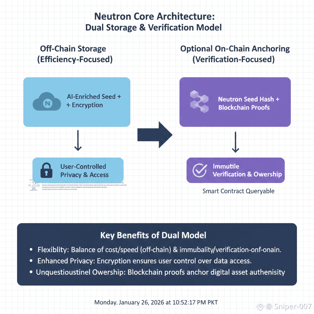 • Optional On‑chain Storage: When users need verification, encrypted references, metadata, and hashes are anchored on Vanar Chain. This provides tamper‑resistant proofs and decentralized ownership tracking.