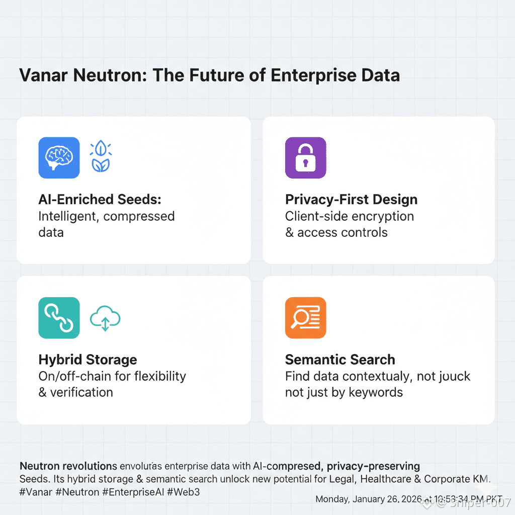 Vanar Chain’s Neutron is an innovative approach that bridges data privacy, ownership, and intelligent AI integration on a decentralized network. Its hybrid storage model — combining off‑chain efficiency with optional on‑chain verification — provides a strong foundation for private yet verifiable data control. With AI‑enriched Seeds and flexible encryption controls, Neutron enables organizations to leverage blockchain trust without exposing private content, marking a significant step forward in how decentralized systems handle real‑world data with enterprise‑grade privacy and compliance.