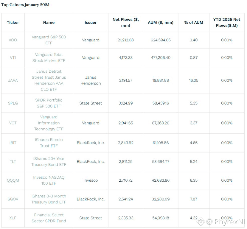 与此同时非常可惜的是,在2025年一月 $IBIT 也就是贝莱德的 $BTC 现货 ETF 还在当月的资金流入中排到了第六名,我要是没记错的话,虽然 $ETH 的现货 ETF $ETHA 没有进前十,但也到了第十三名,但到了 2026年 IBIT 已经在前十中看不到了。