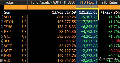 这些资金主要进入的是和 标普500 相关的 ETF 中,包括了 $VOO $SPYM 和 $RSP ,这三个资产的总流入资金量就已经超过了 311.6 亿美元,占了总资金流入量的 25% 左右。