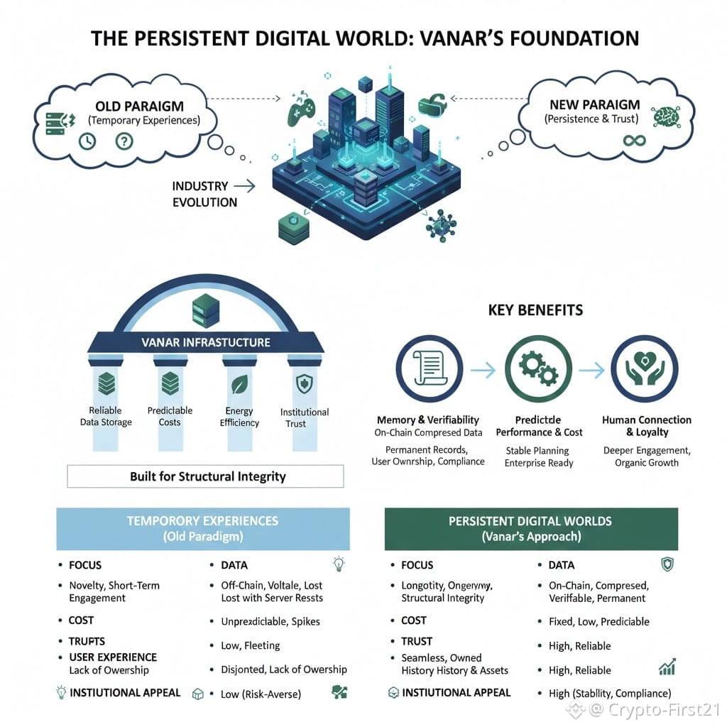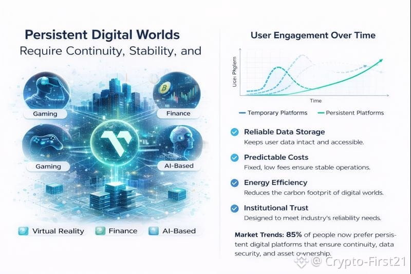 If you examine the trend of digital world development, you will see that people are no longer interested in temporary experiences that disappear with server restarts or platform closures. They want persistence, memory, and trust. A persistent digital world, whether it is a gaming world, virtual reality world, financial world, or AI-based world, requires a system that is capable of storing data in a reliable manner, handling identity in a secure manner, and scaling without failing under pressure. Vanar was created with this in mind. Rather than optimizing for pure speed, Vanar optimizes for the structural needs of a persistent digital world. What this means is that it is intended for reliable data storage, predictable costs, energy efficiency, and systems that institutions can trust. While these may seem like technical specifications, at the end of the day, they are all about one thing: making digital worlds feel trustworthy.