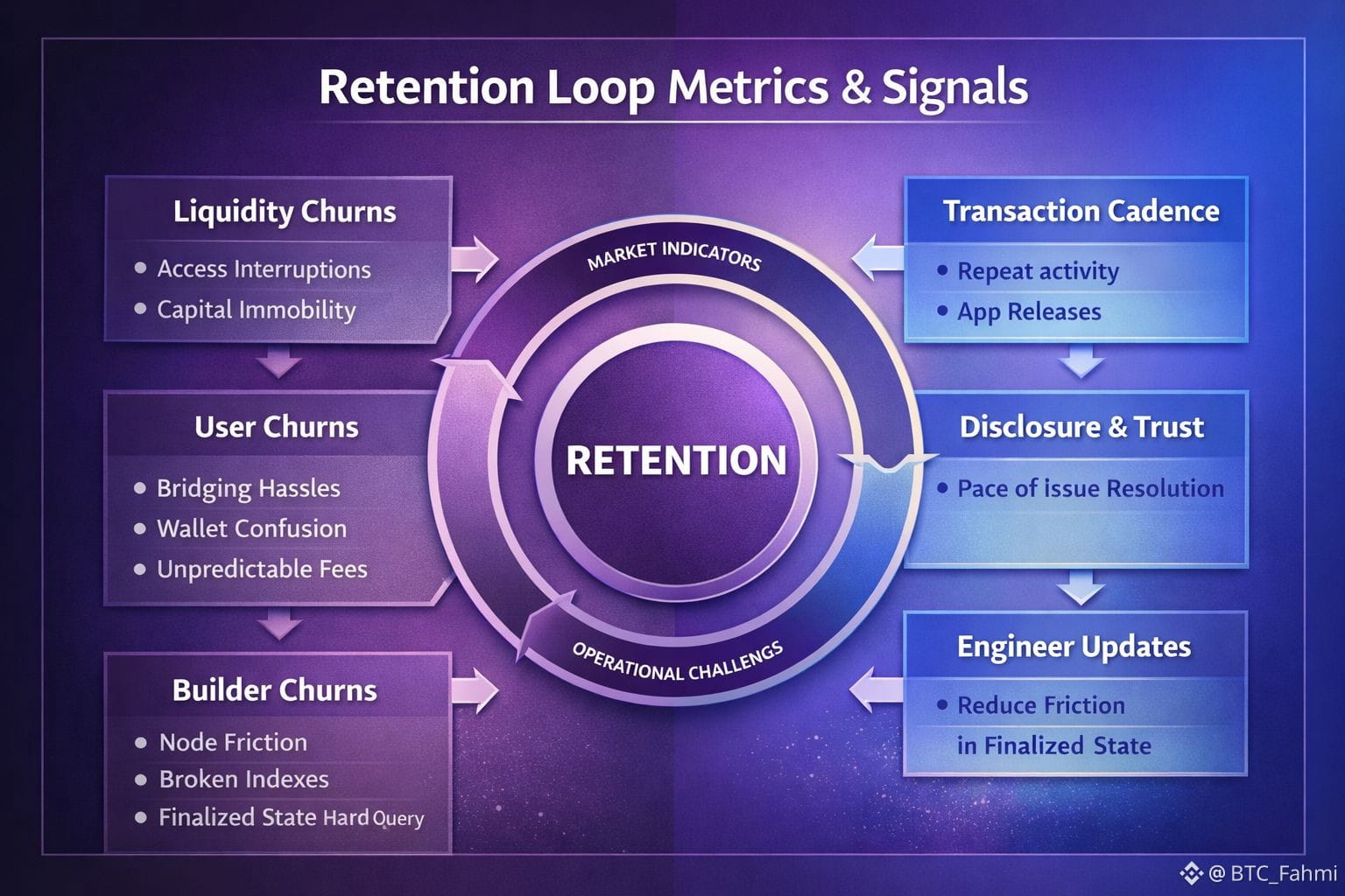 Retention is not only a social metric. It is operational and economic. Users churn when bridging is flaky, wallets confuse them, or fees feel unpredictable. Builders churn when nodes are annoying to run, indexes break, and “finalized” data is hard to query reliably. Liquidity churns when access is interrupted or when traders cannot move capital where it needs to be. You can have a chain with clean finality and still lose the room if the surrounding experience cannot hold attention for months.