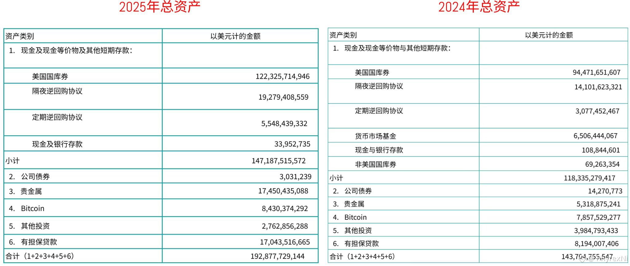 另外更加重要的是 2025 相比 2024 Tether 稳定资产(美债现金等)占比从 82.35% 降到 76.31%,非稳定资产(贵金属 Bitcoin 等)占比从 17.65% 升到 23.69%。