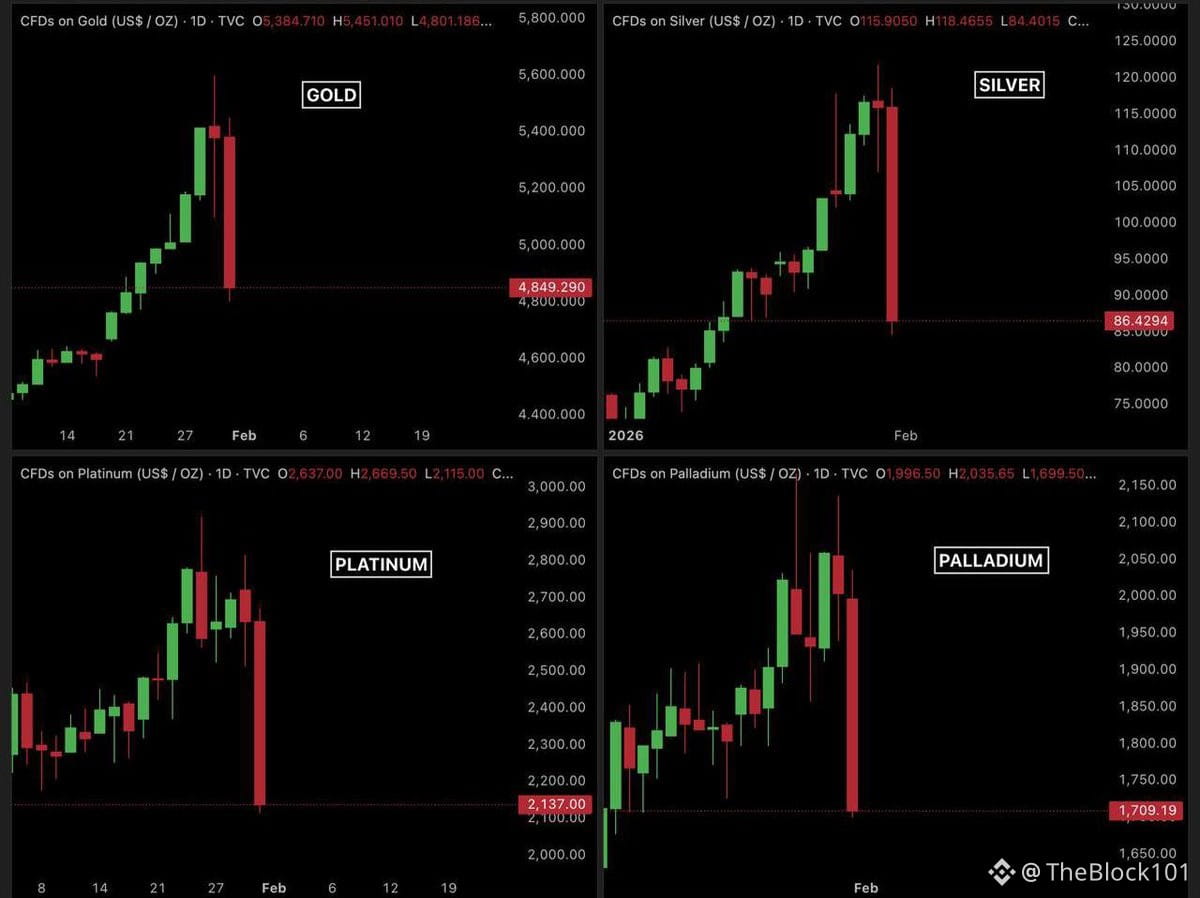 Chỉ trong chưa đầy 36 giờ, thị trường kim loại quý toàn cầu đã trải qua một trong những cú điều chỉnh dữ dội nhất nhiều năm trở lại đây. Giá vàng lao dốc từ vùng 5.600 USD xuống quanh 4.700 USD. Bạc rơi tự do từ 121 USD về sát 77 USD. Platinum và palladium cũng không tránh khỏi số phận tương tự.