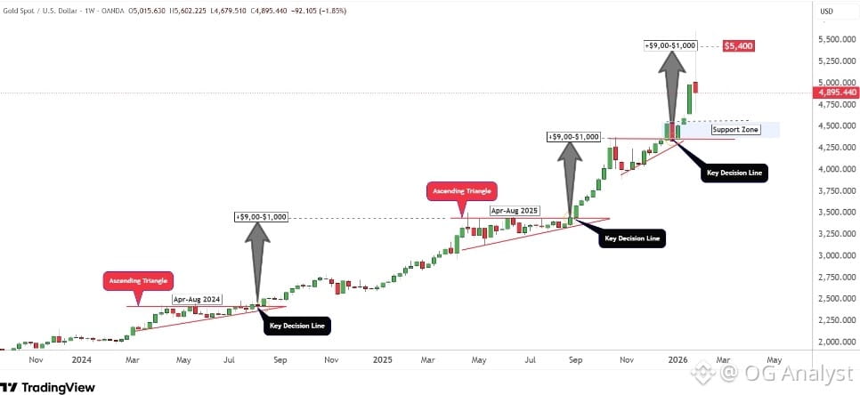 Since 2024, the market has advanced through a series of ascending formations, each followed by consolidation and continuation. The breakout above the $4,400 zone was especially important — it marked acceleration, not exhaustion.