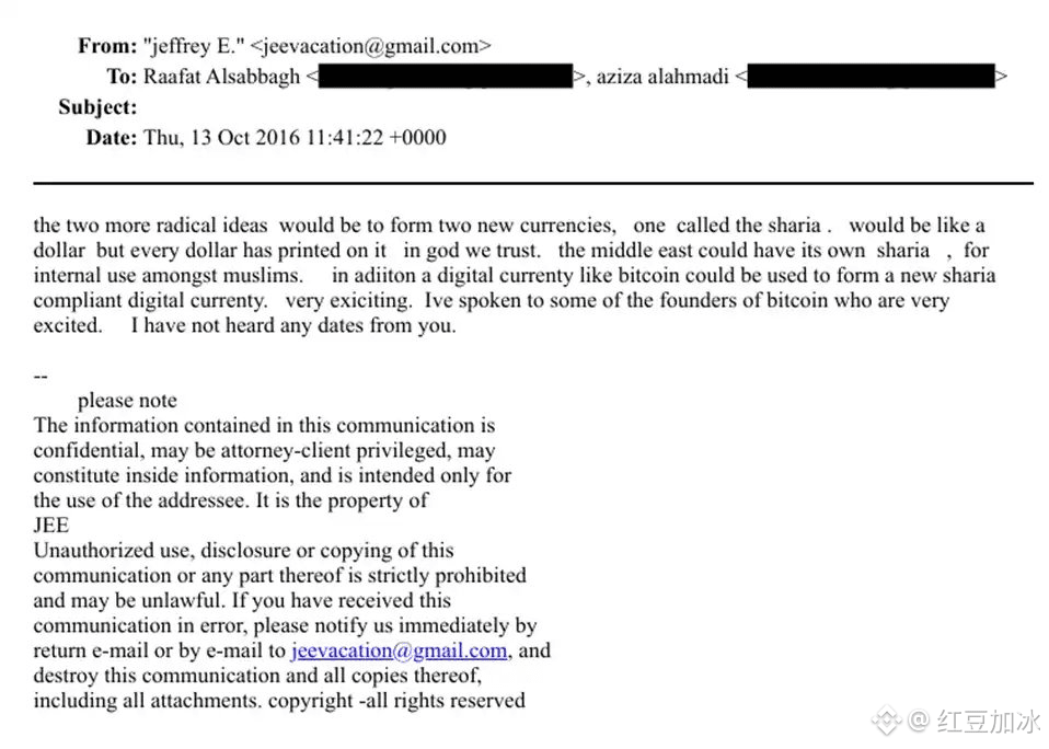 2016年,爱泼斯坦在写给沙特皇家法院顾问拉法特·阿尔萨巴格的邮件中,提出了两个“激进”想法。一是创建中东地区专属的“沙里亚法”货币,二是开发基于比特币技术的、符合伊斯兰教法的数字货币。